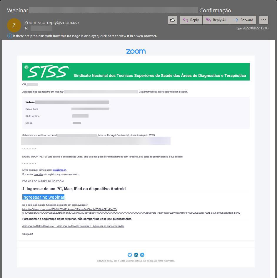 O envio do link de acesso ao webinar será efetuado com uma antecedência mínima de uma hora antes do início da sessão, através do email